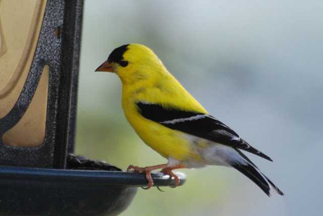 I saved these for last, because I have never seen an American Goldfinch in his full yellow glory at the office deck. He came one morning, the window was open, and the coffee went cold.