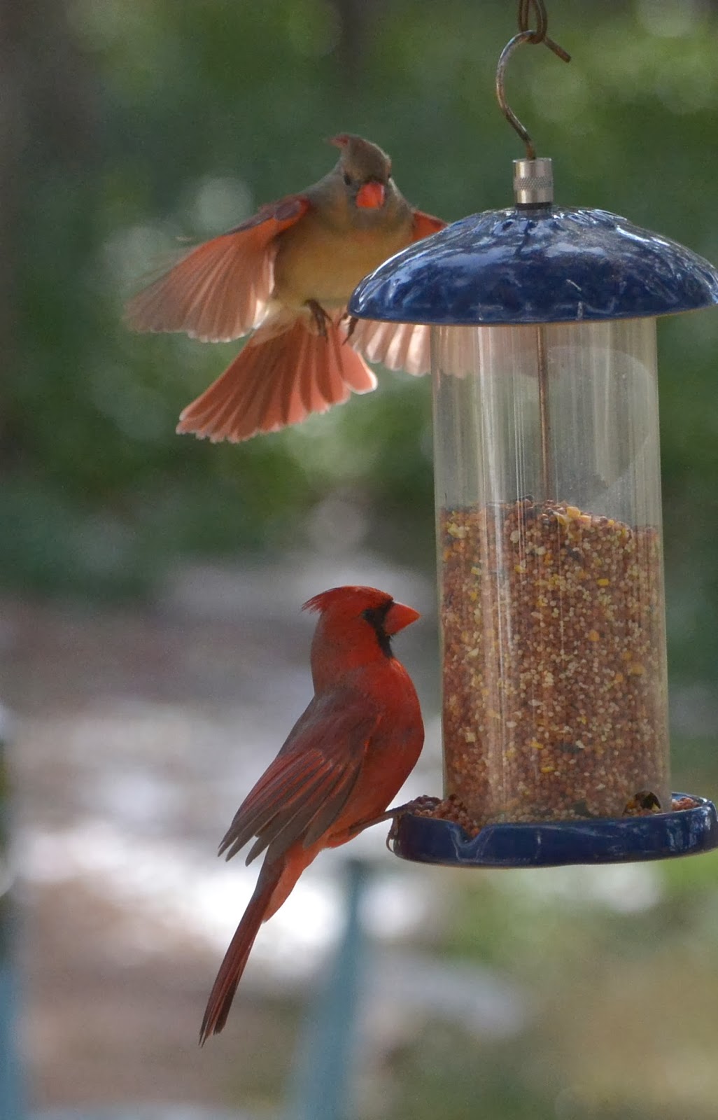 The Cardinals and Chickadees were trading positions at the ceramic feeder just off the porch.
